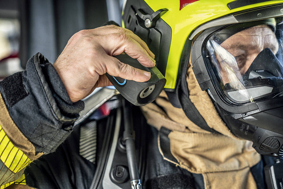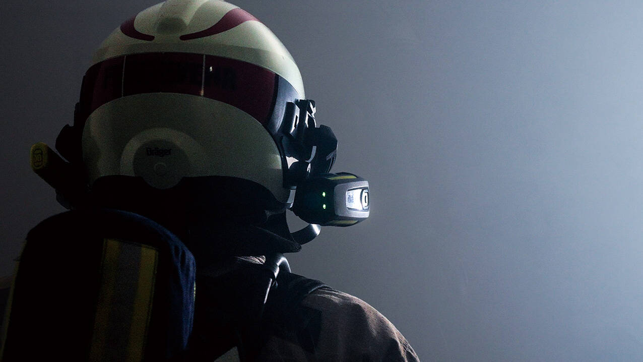 Dräger UCF FireCoreの熱画像カメラはマスク内に設置したディスプレイとの併用で、極めて過酷な条件下でも周囲の状況を常時、画像化・視覚化できますので、より素早く安全に位置確認しながら状況認識することが可能です。熱画像カメラをヘルメットに取り付けることでハンズフリーの状態で使用できますので、最も重要な任務である人命救助に集中できます。
