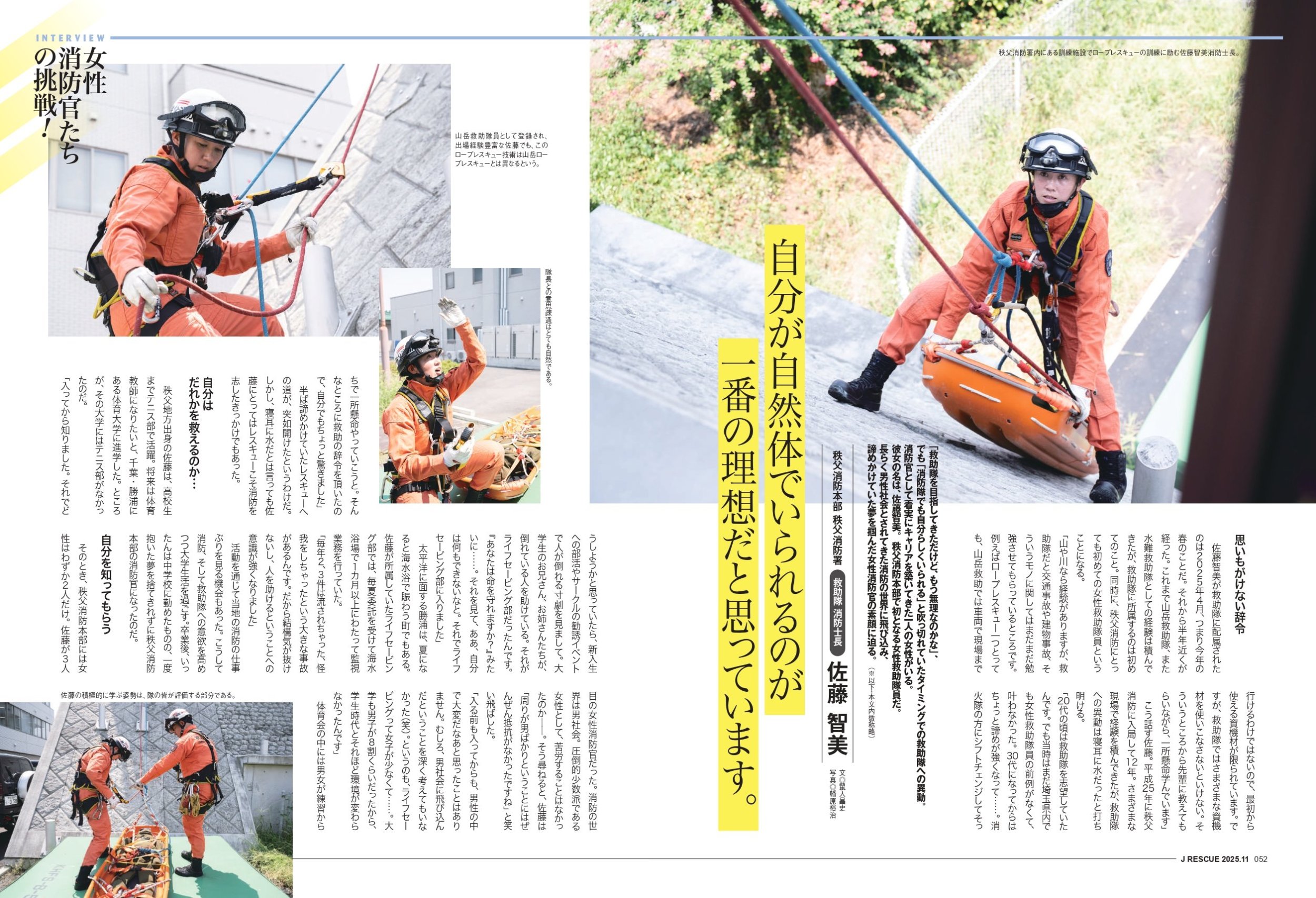 消防隊・救助隊・救急隊・警防課など、さまざまな分野で活躍する女性消防官をインタビュー。それぞれの消防本部で第一人者として道を切り拓いた者、出産・育児を経て活躍するフィールドを変化させていった者、周囲の理解と協力を得ながら後進の道しるべになろうとする者、自分の夢に向かって一歩ずつ進み始めた若手など、それぞれの女性消防官が経験したリアルな体験談を中心に紹介します。