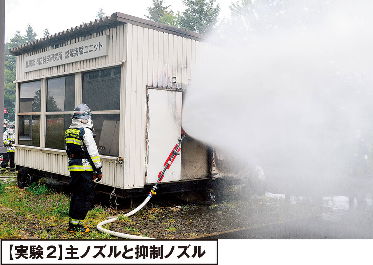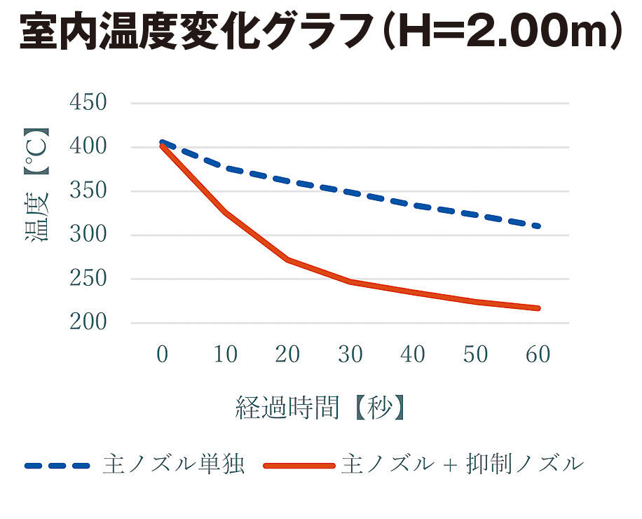 主ノズルを単独で使用した場合は緩やかに室内の温度が低下し、1分間の計測で95℃の温度低下が認められた。主ノズルと抑制ノズルを併用して使用した場合では、放水から20秒間で100℃程室内の温度が低下し、その後も緩やかに温度低下し、1分間の計測で184℃の温度低下が認められた。