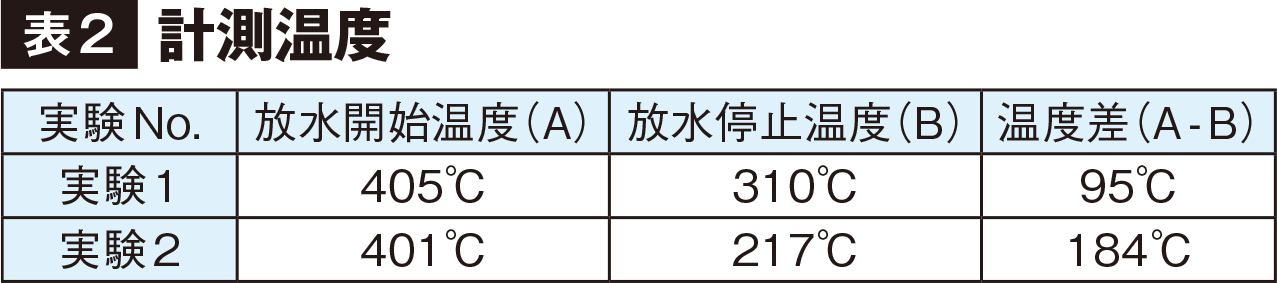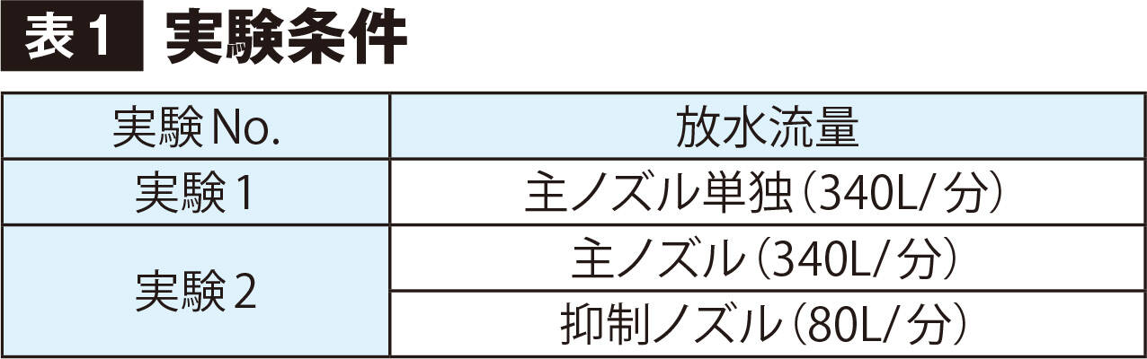 実験は、[表1]に示す放水条件で水力換気ノズルによる放水を行い、室内吸気側高所(H=2.00m)の温度変化について各1分間の計測を実施した。なお、この燃焼実験ユニット(D5.3m×W3.4m×H2.8m)は排気口(W0.9m×H0.9m)および吸気口(W0.9m×H1.8m)を各1カ所、対面上に設定している。